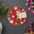 A beautiful pichwai artwork showcasing three cows in a perfect circle. The cows are adorned with intricate jewelry and stand on a wooden plate with a colorful floral border.